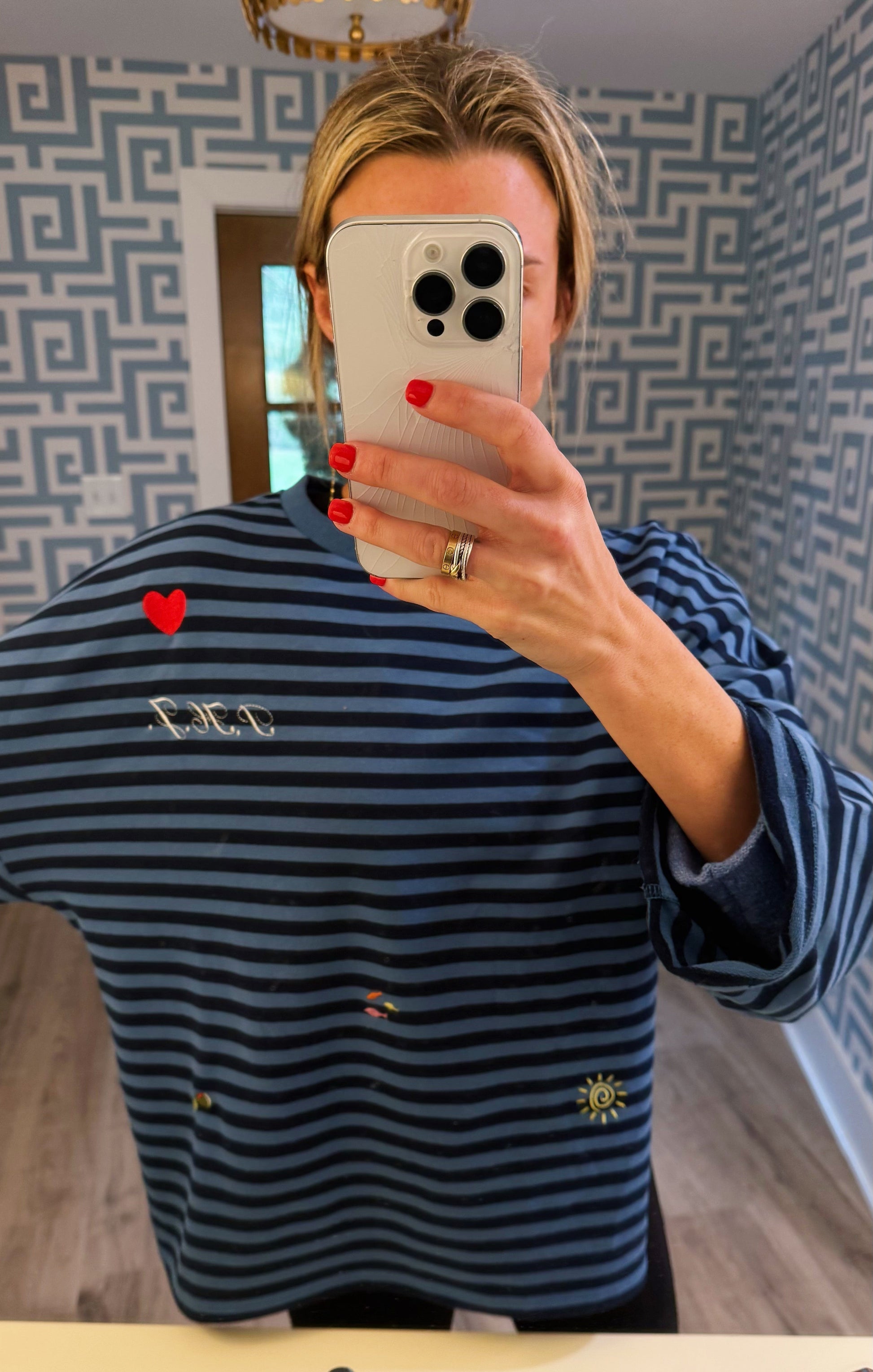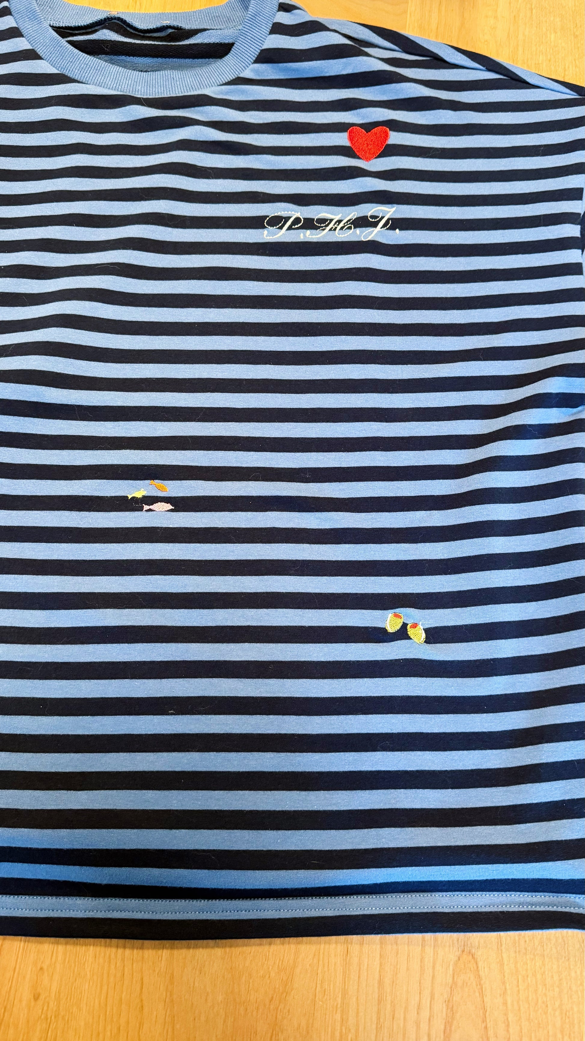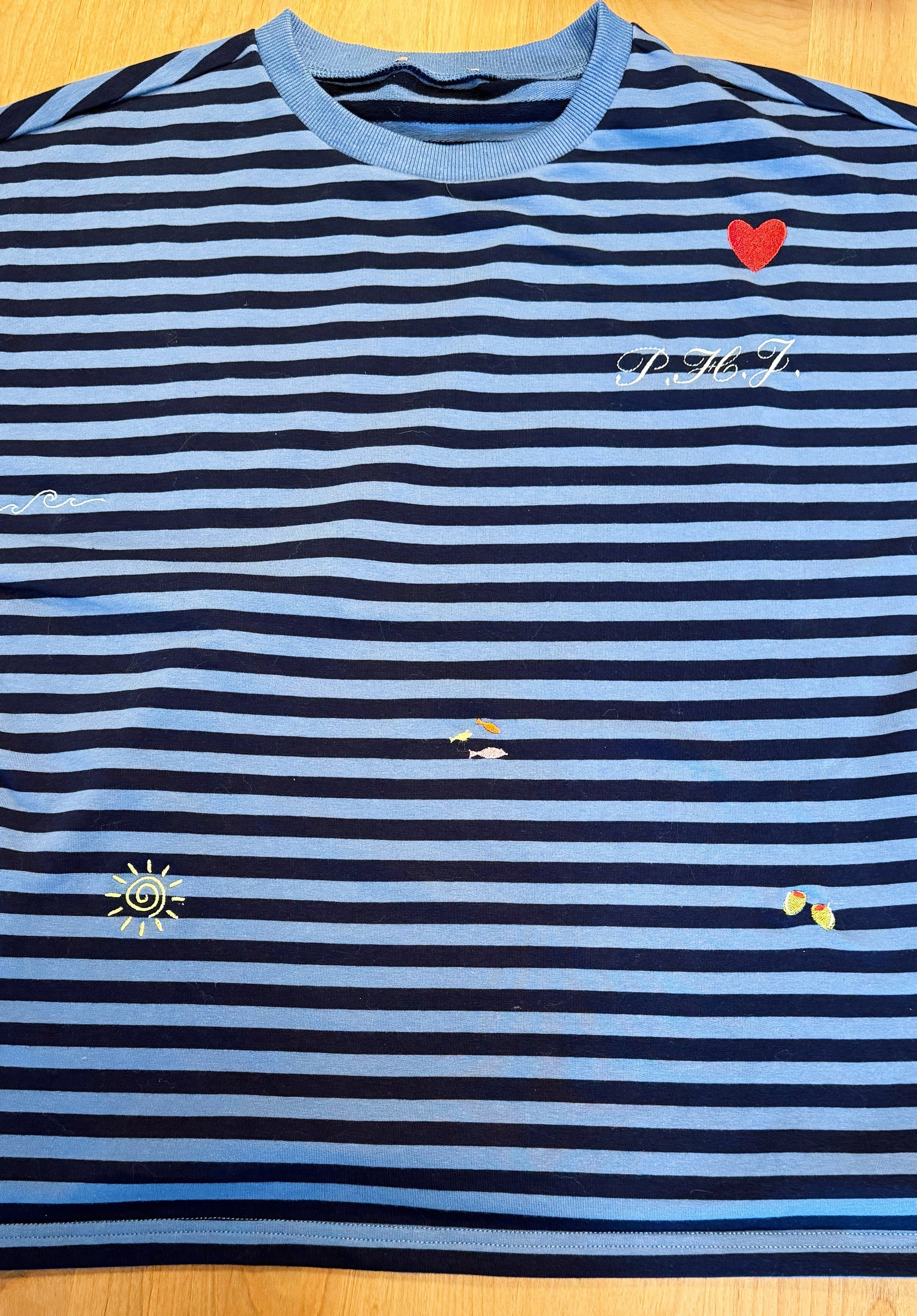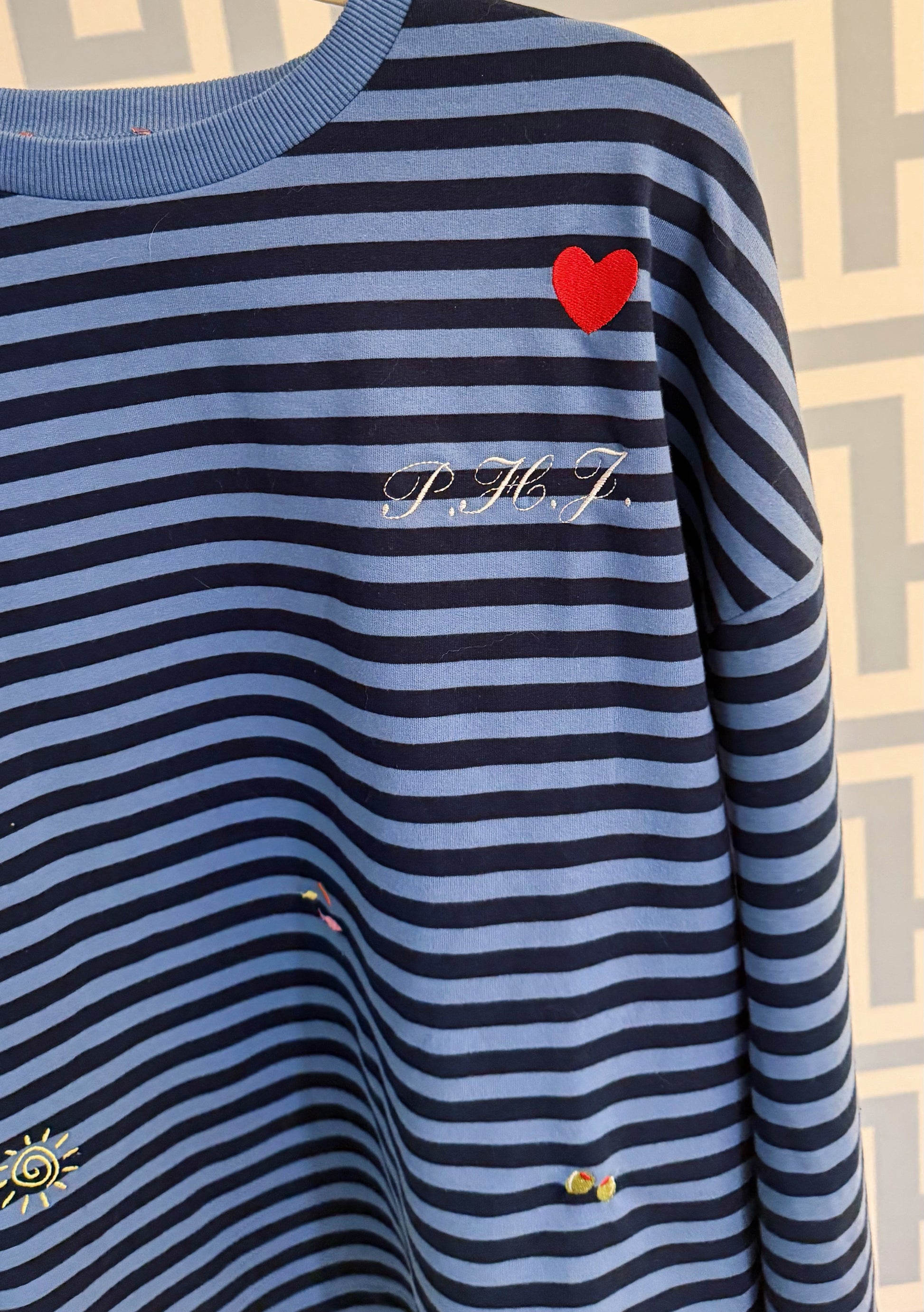 No 2 sweatshirts are alike! Come with varying motifs - suns, hearts, fish, olives, waves, spritz, etc.!